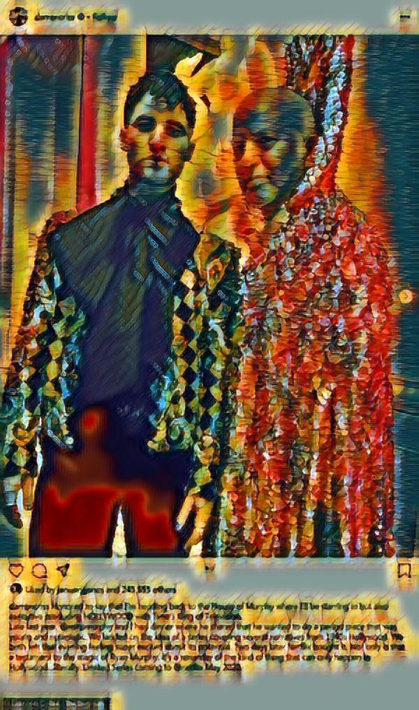 He wore a white zipper jacket over a white shirt and long black tie along with white trousers.